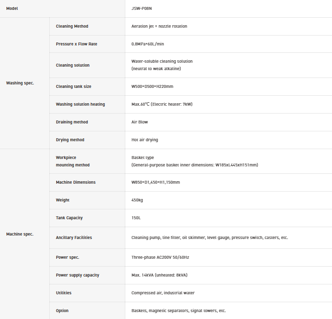 - This one machine can do everything from washing to drying! : The two upper and lower rotating nozzles and swirling flow allow for cleaning of complex shaped workpieces without any blind spots. The aeration jet and heating effects enable powerful cleaning and foreign matter removal without the use of organic solvents. In addition, the process can be fully automated, from cleaning in water and air to draining with air blowing and hot air drying. Drying can be performed immediately after cleaning without manual intervention.