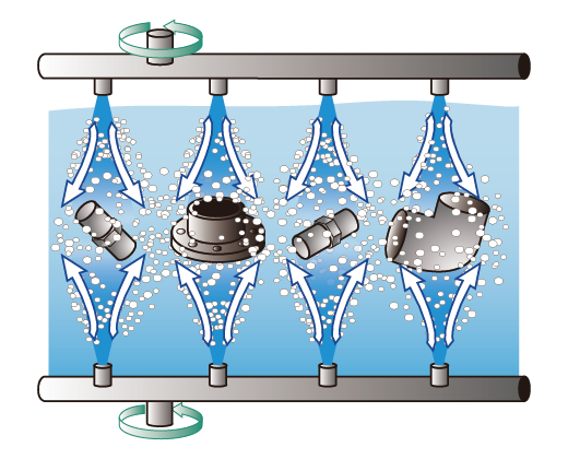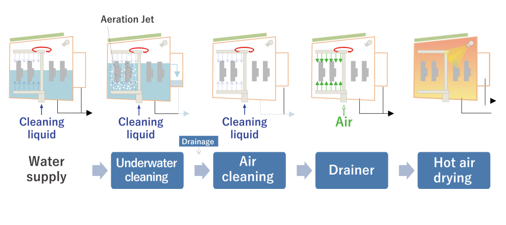 - The underwater aeration jet provides powerful cleaning even inside parts! : An aeration jet is a jet stream containing air bubbles. The aeration jet emitted from a rotating nozzle reaches every hole and inside the workpiece, pulling away dirt and oil. The force of the aeration jet emitted from both above and below thoroughly removes dirt even from the inside of parts with complex shapes.