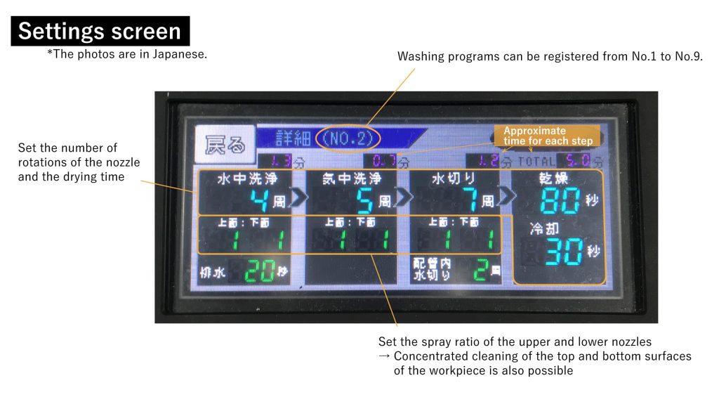 - Detailed settings can be achieved with simple operations! : Setting washing conditions is simple, just enter values into the touch panel, so anyone can use it easily. In addition, up to nine washing conditions can be saved, so you can simply select a saved condition and press the operation button to complete washing and drying of the workpieces.
