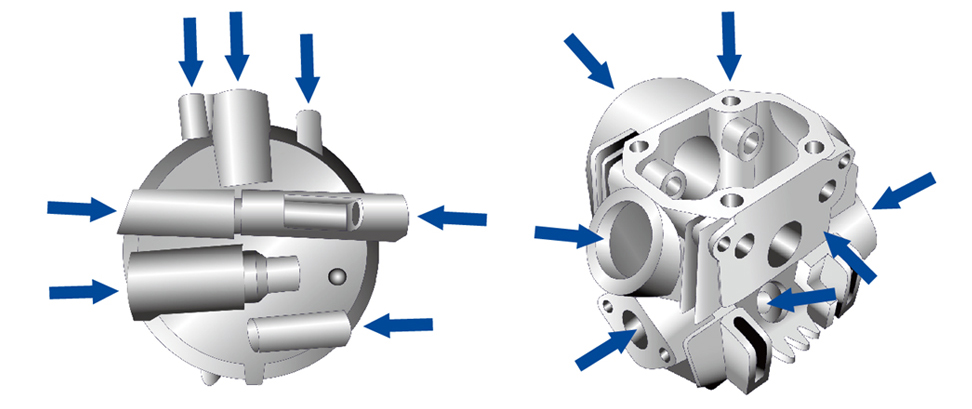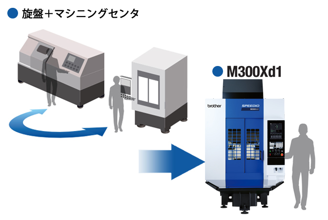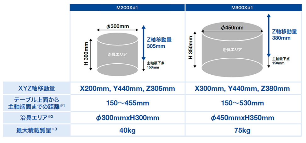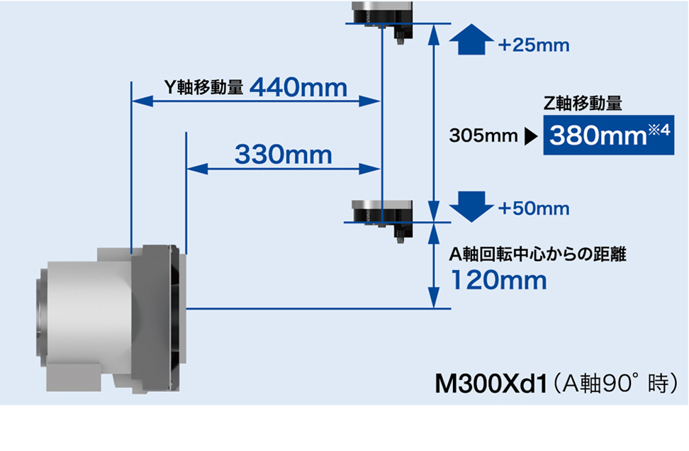 A wide jig area is secured, allowing flexibility in jig design and supporting a variety of machining workpieces. In particular, the M300Xd1 has an increased jig turning diameter of φ450, an increased Z-axis travel distance of 380mm, and an increased distance from the table top to the spindle end. This ensures a wide machining area in the Z-axis direction and improves tool accessibility.