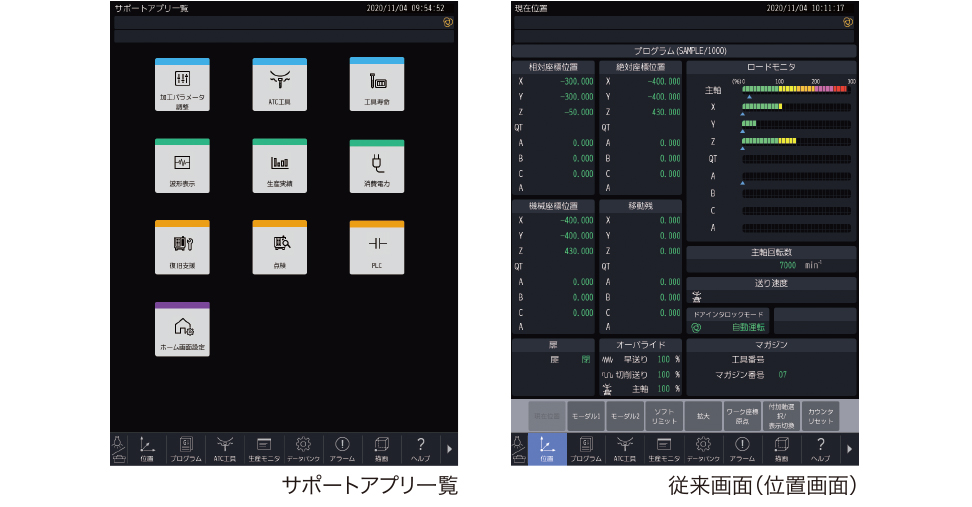 New support apps have been developed that consolidate related functions and provide visual displays for improved ease of use and visibility. The device is equipped with convenient functions such as a calculator, memo pad, and file viewer, and operation via the conventional screen is also easy with the touch panel, making the device much easier to use.