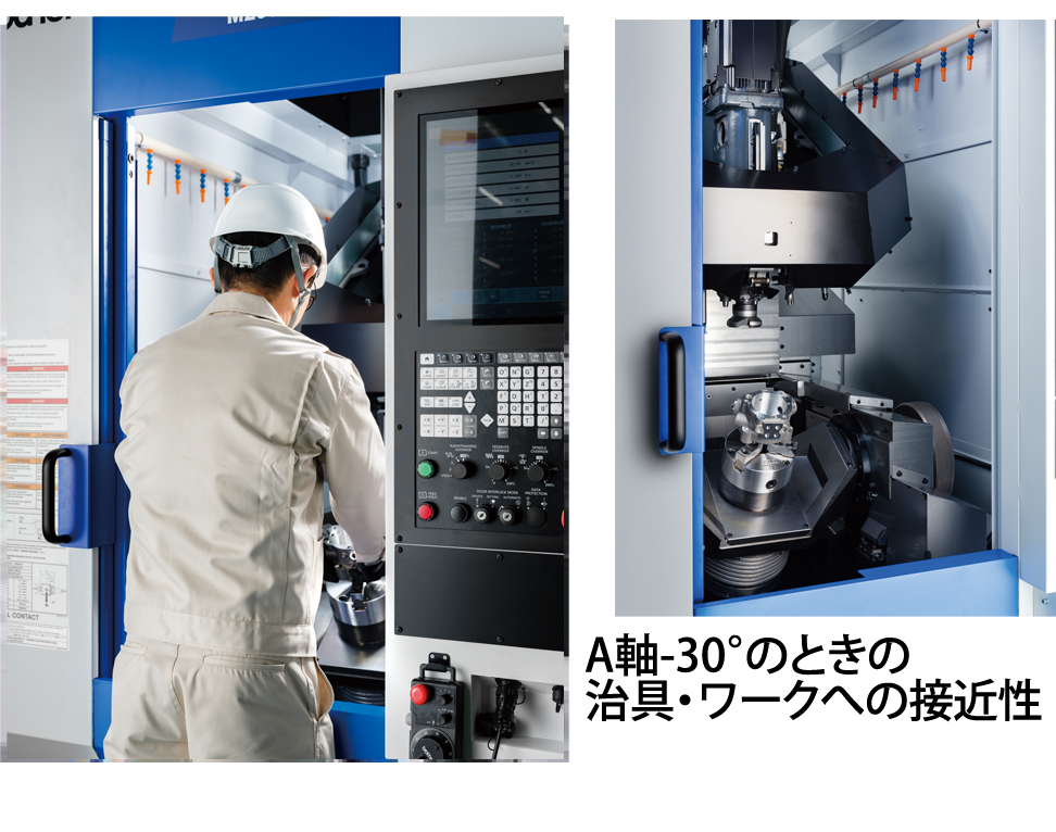 Even when the A-axis is at 90°, sufficient Y-axis travel is ensured, and the increased Z-axis travel and maximum tool length improve tool accessibility.