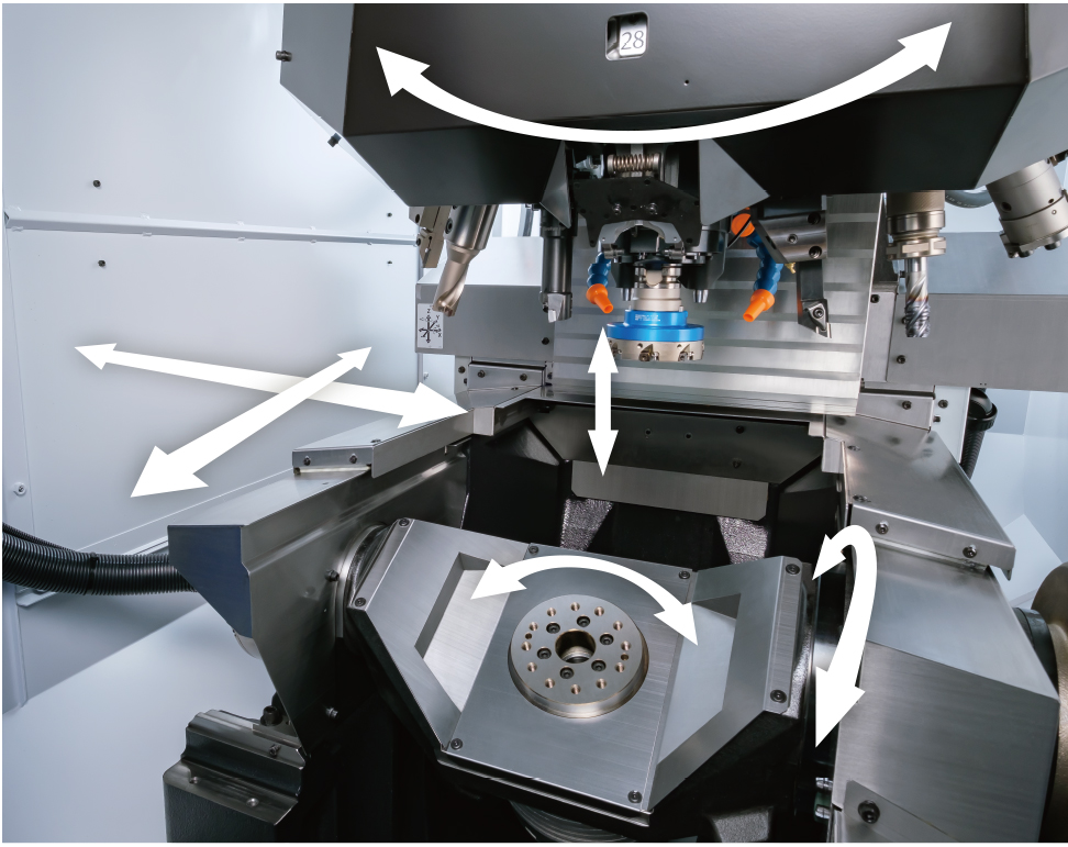 The newly developed turret magazine that can store 28 tools further promotes process integration through combined machining and multi-faceted machining.