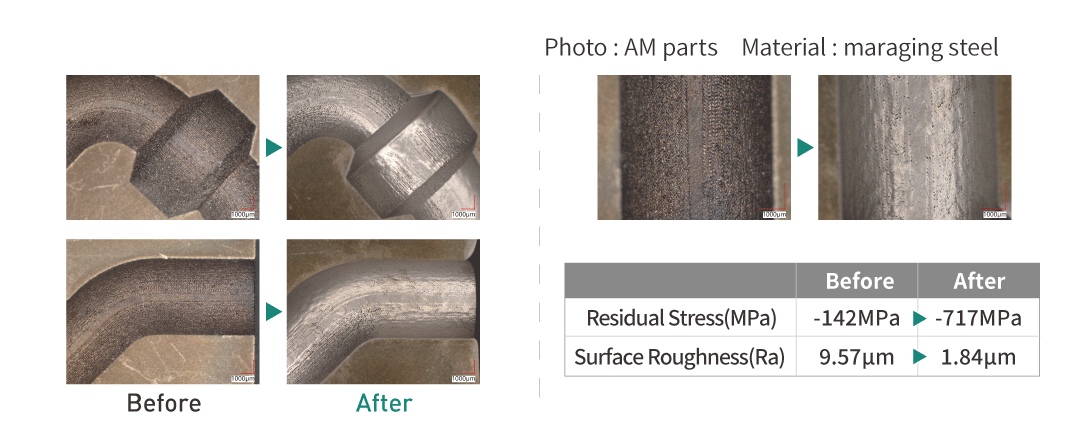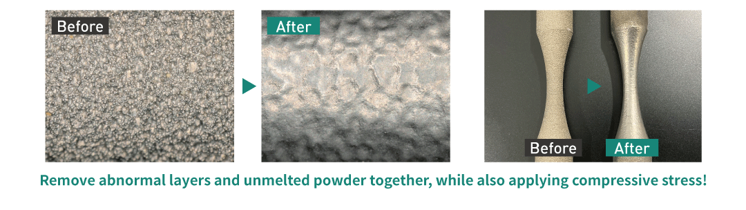 By removing abnormal layers and unmelted metal powder, compressive stress can also be imparted, improving the fatigue strength of the component.