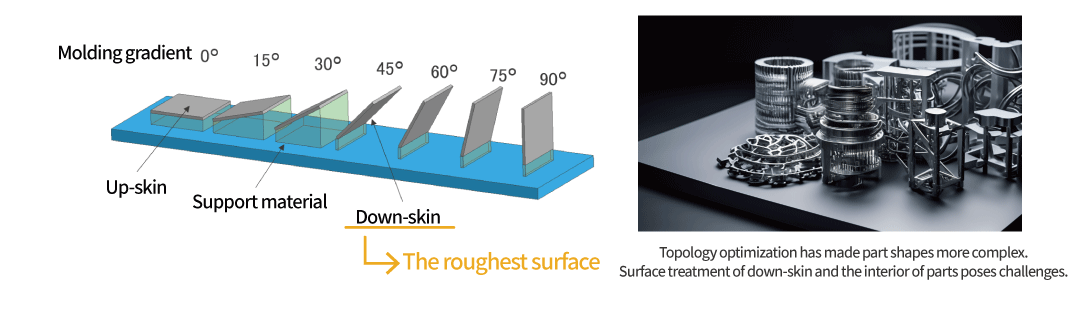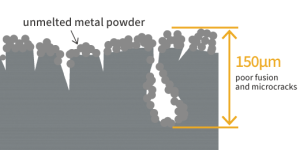 If abnormal layers are present, there is a risk of component breakage and insufficient fatigue strength. Additionally, any remaining unmelted metal powder on the surface increases the frictional resistance of fluids.
