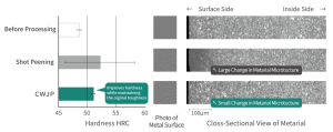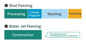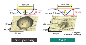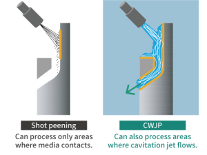 Unlike shot peening, which can only be applied to areas where the media makes contact, CWJP can perform peening in the path of the cavitation jet flow.