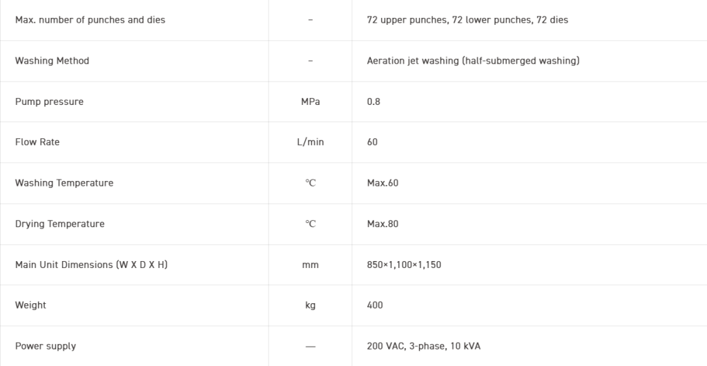 - The compact main unit contains a large washing tank : Even at a width of 770 mm, the washing machine is provided with a 65-L washing tank which can be used to simultaneously wash 72 sets of punches and dies.
