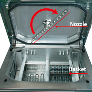 - High power washing and degreasing performance : Because of the upper rotating nozzle and swirling flow, the residual medicines can be washed away without leaving any blind spots. As a result of the aeration jet and heating, high power degreasing and removal of impurities is achieved without the use of an organic solvent.