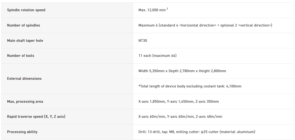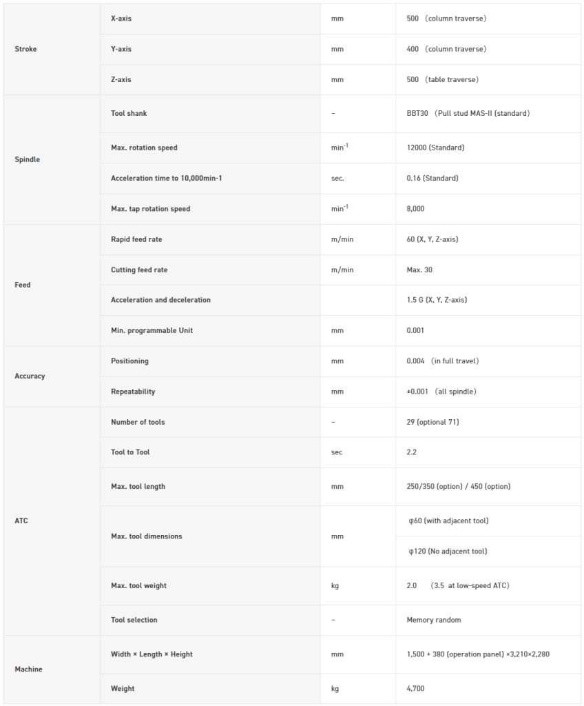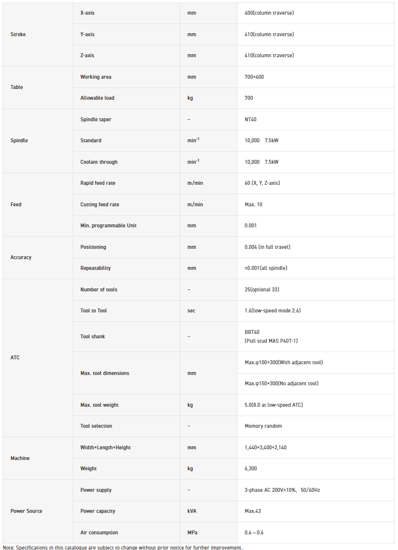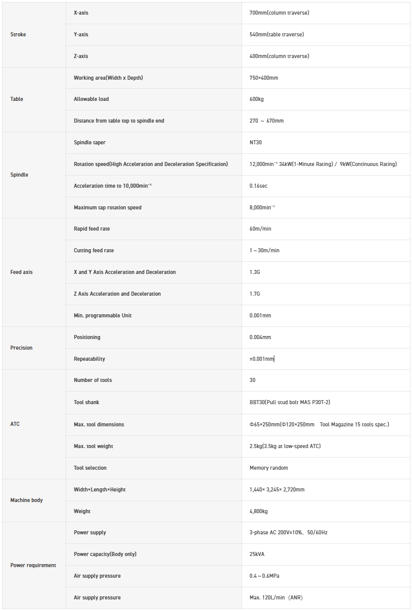 The machine width is 1,440mm × depth 3,245mm, with a significantly wide stroke: X-axis 700mm, Y-axis 540mm, Z-axis 290mm, ensuring expansive travel relative to its width. Improving productivity per unit area.
