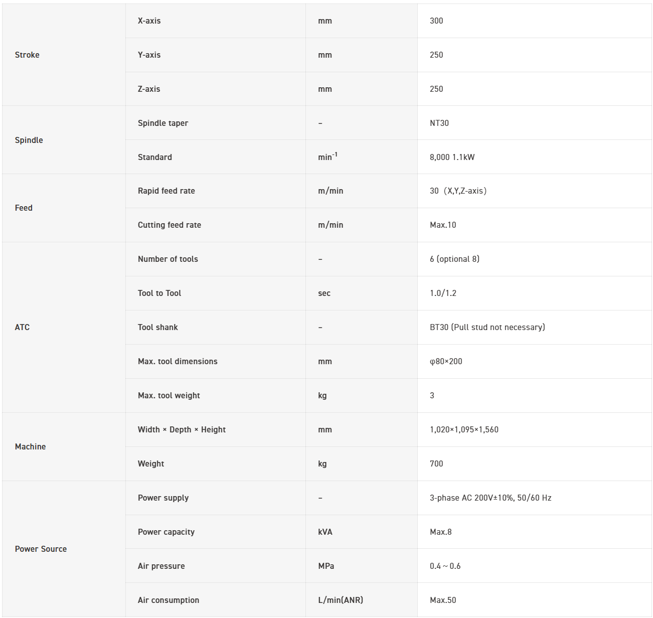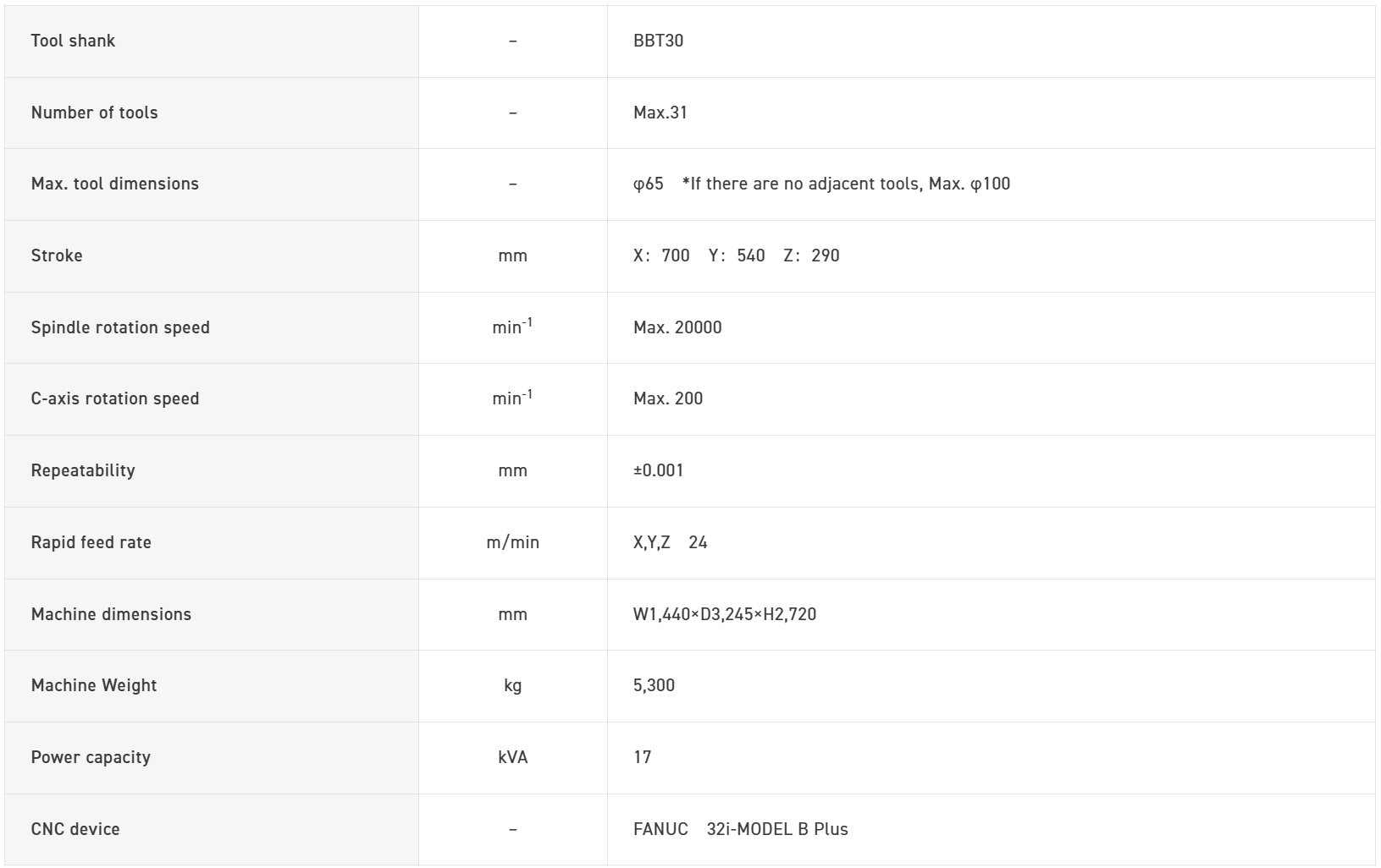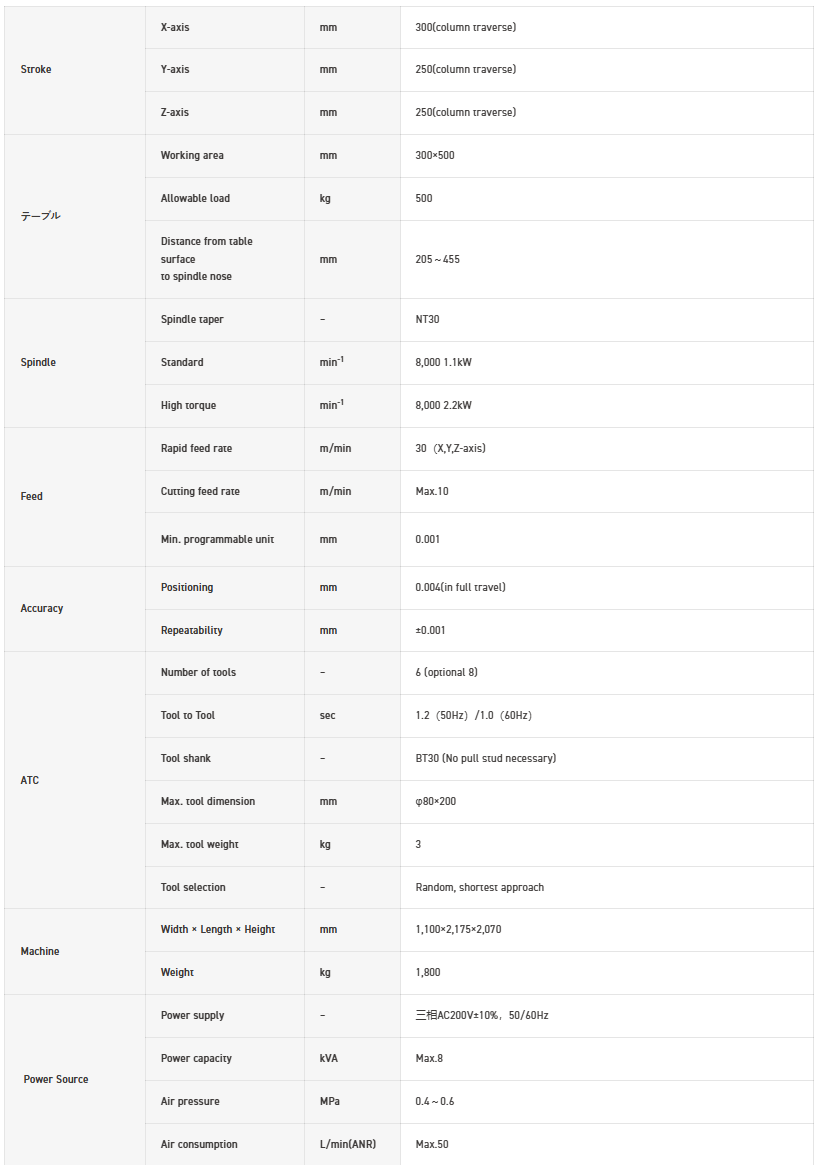 The machine width is 1,440mm × depth 3,245mm, with a significantly wide stroke: X-axis 700mm, Y-axis 540mm, Z-axis 290mm, ensuring expansive travel relative to its width. Improving productivity per unit area.