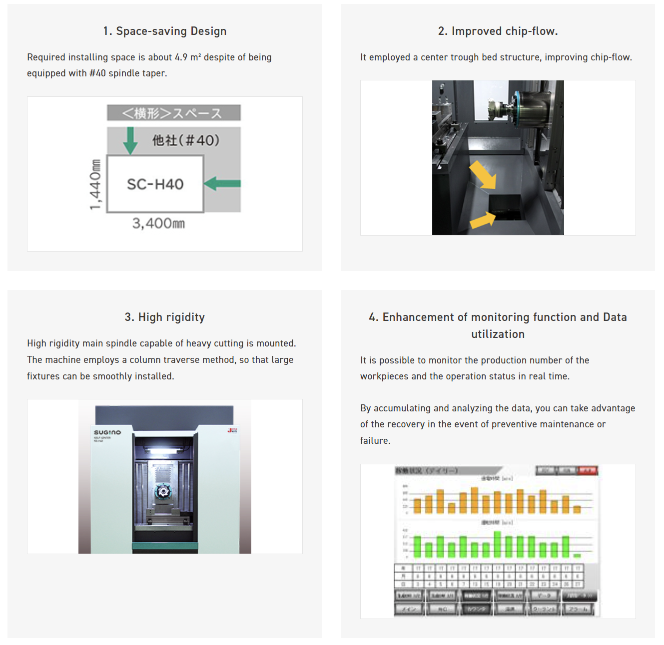 For example, in the space previously occupied by three #40 machining centers from other manufacturers, the compact SC-V40a allows for the installation of four units. Even a single unit is easy to install, allowing for effective use of available space within the factory.