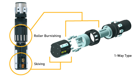 The tool skives on the forward stroke and burnishes on the return stroke. With the 2-way operation, as skiving and roller burnishing operations are completed in each stroke, optimizing of speed and feed can be made separately for skiving and roller burnishing. However, with the 2-way operation, the operating time can be longer since quick retract(return) is not possible.