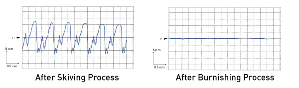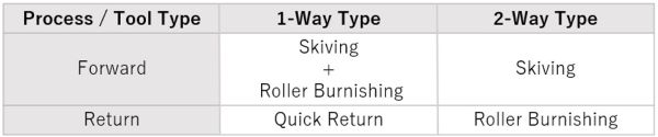 Skiving and roller burnishing process is performed in the forward feeding direction, and operation is completed very quickly. With the 1-way operation, skiving and roller burnishing work in the same feeding direction, and operating time is quite short.