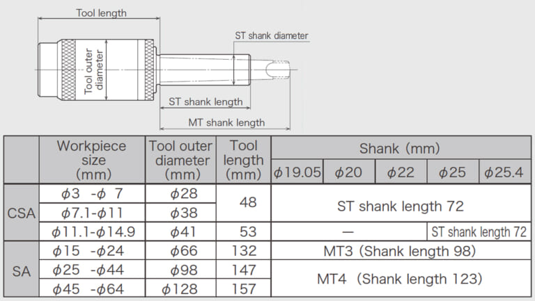 Available workpiece shape: Outer surface (Shaft / Shaft with step) Available driving units: Machining center, Engine lathe, Turret lathe, Swiss lathe*, Drilling machine, Drilling unit *CSA type Workpiece size: CSA: φ3-φ14.9 SA: φ15-φ64