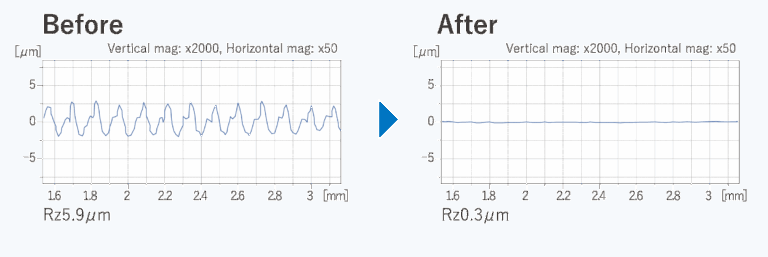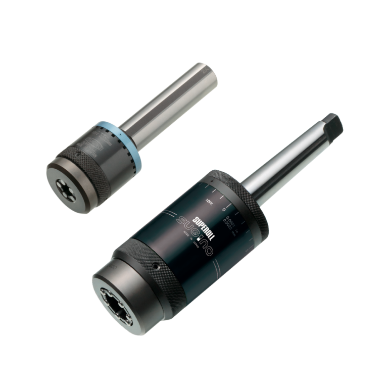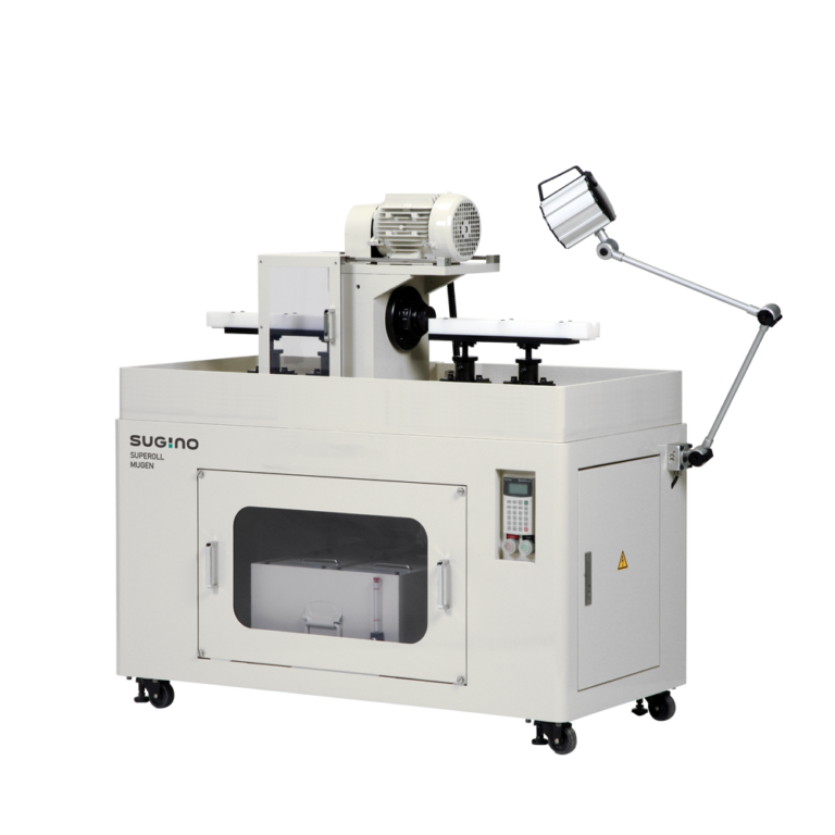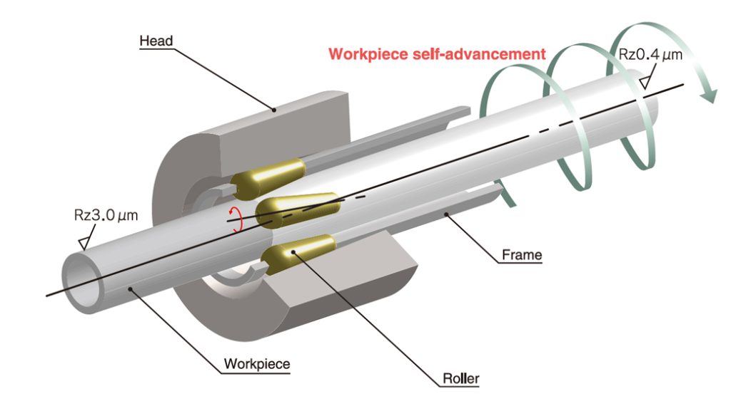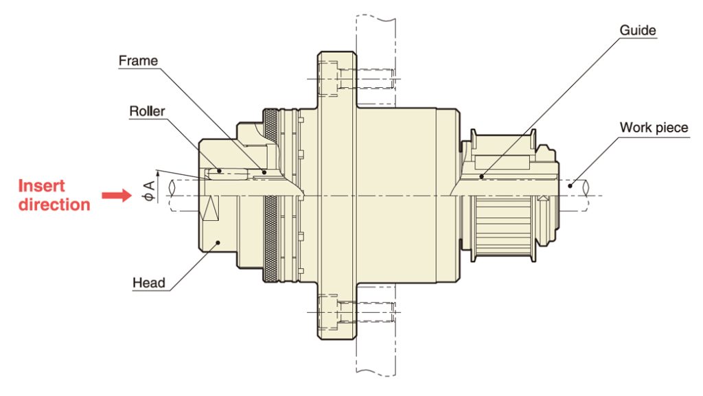 As the roller inside the SUPEROLL head is inclined at an angle, the workpiece is discharged backwards, rotating like a screw when the frame is rotated. (Self-propulsion of workpiece) SUPEROLL MUGEN does not require a special feed device and, in principle, it can process outer surfaces of unlimited length. Equipped with a 0.0025 mm (1 scale mark) micro-adjustment mechanism. The optimal SUPEROLL head can be selected according to the workpiece dimensions.