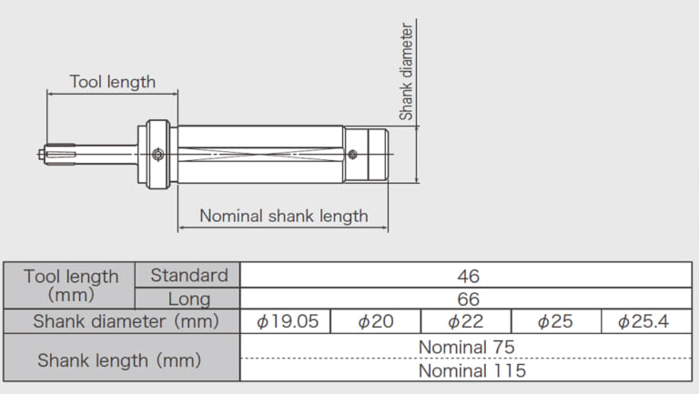 Available workpiece shape: Blind-hole Available driving units: Machining center, Engine lathe, Turret lathe, Drilling machine, Drilling unit Hole size: Standard: φ8.5 – φ200mm Special: φ6.0mm or more