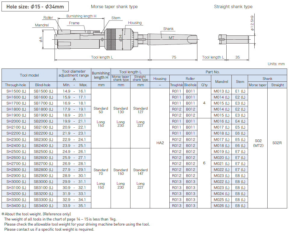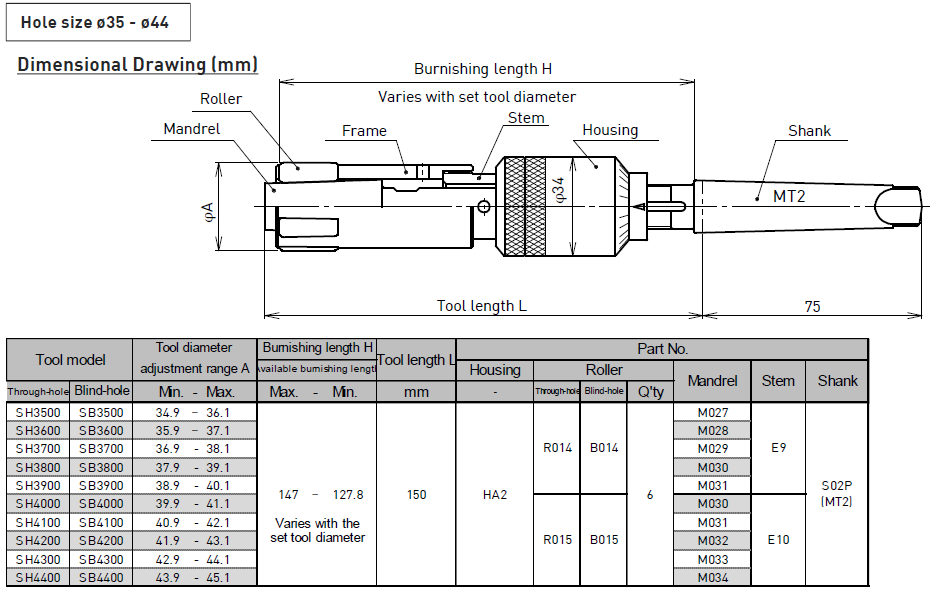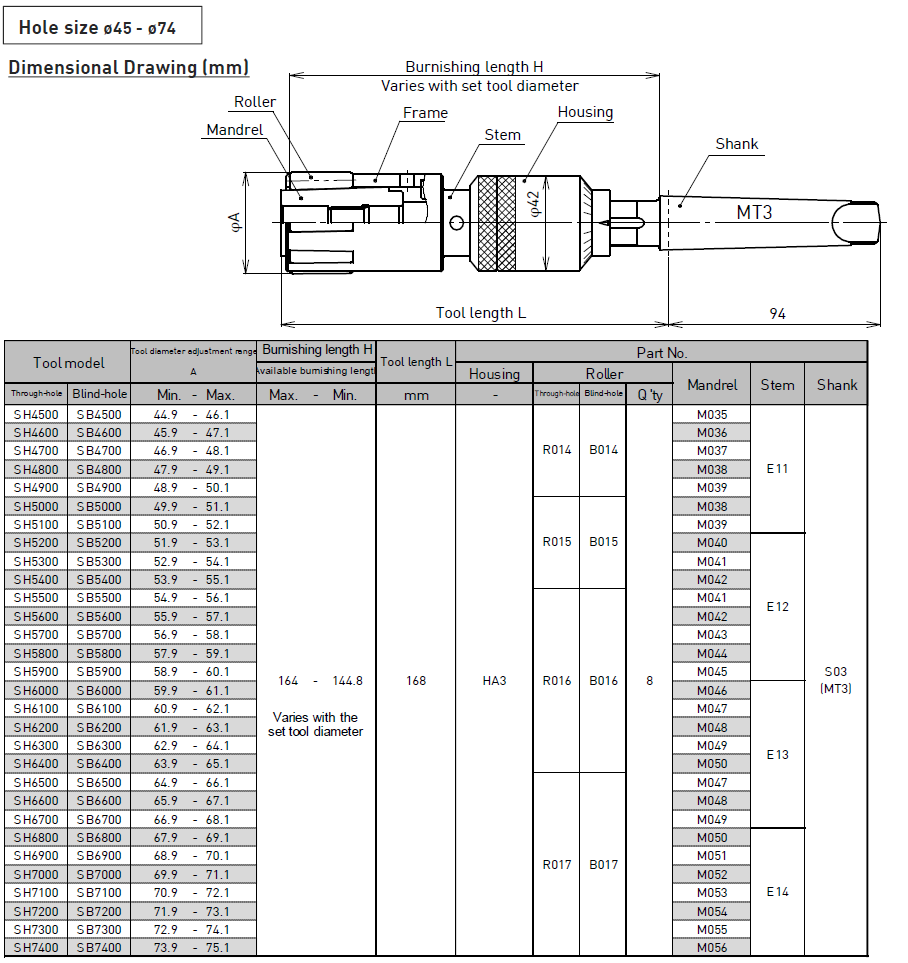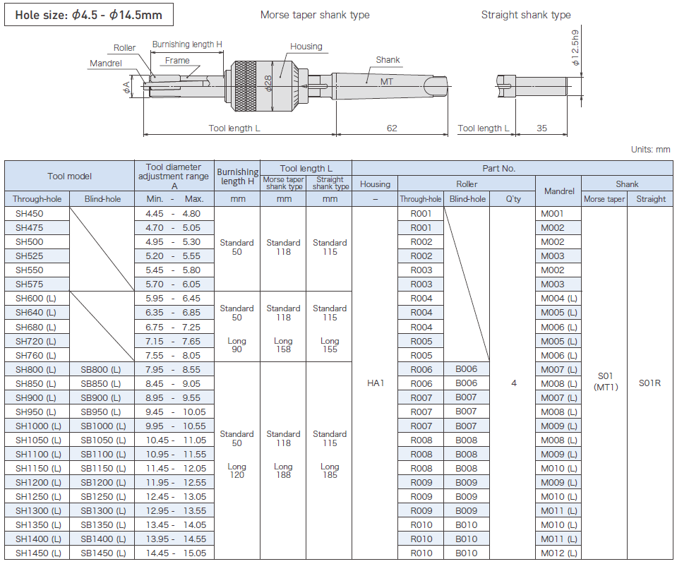 Available workpiece shape: Through-hole, Blind-hole Available driving units: Machining center, Engine lathe, Turret lathe, Swiss lathe Hole size: φ3-φ14.9 Burnishing length: Standard:30mm, Long: 50mm