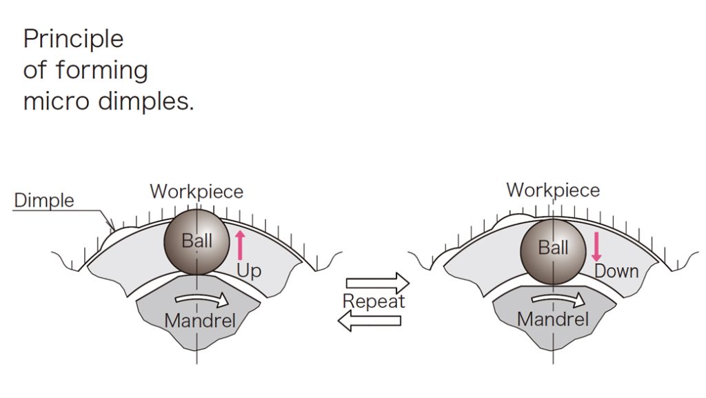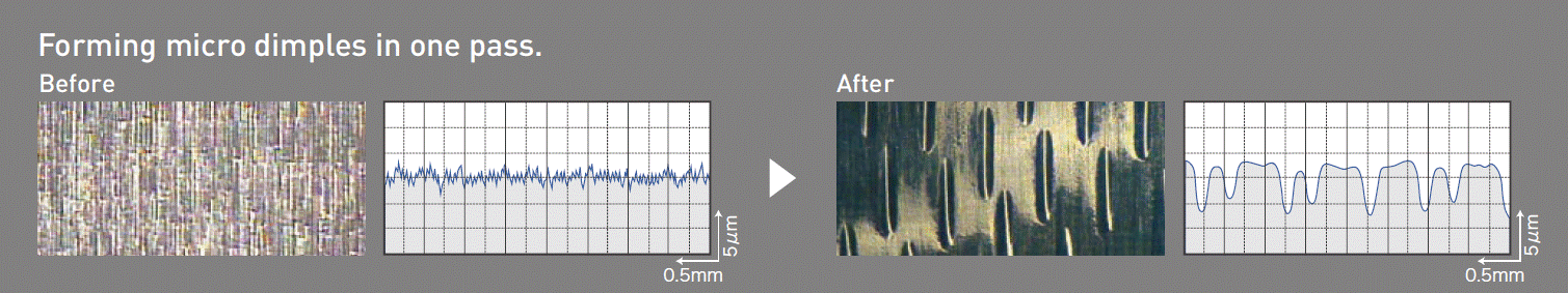 SUPEROLL BP can form micro dimples (dent) of tenth of a few μm depth on a metal surface. It allows to form micro dimples at high speed by giving predetermined rotation and feed, and projecting balls embedded in it regularly.