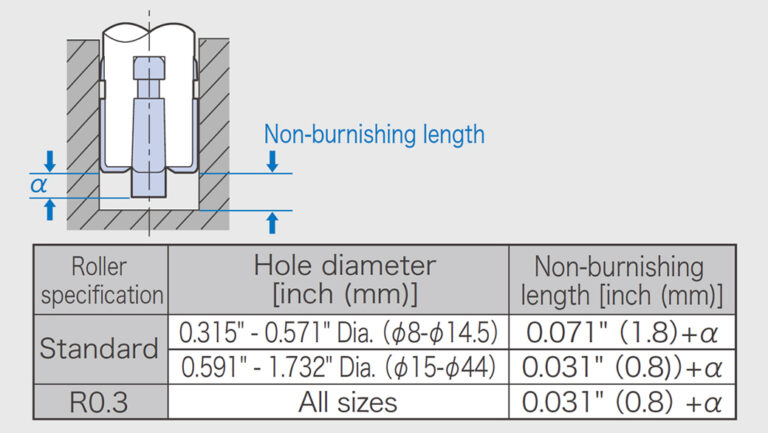 *Depending on the setting tool diameter, the mandrel protruded length from the roller tip may interfere with the bottom surface of workpieces. In that case, cut or grind the protruded length of the mandrel by grinding or other means before using. For more details, please scan the two-dimensional bar code on the right and refer to Selection chart & Burnishing conditions.