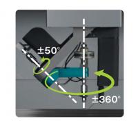 The A-axis can tilt up to ±50 degrees, while the C-axis can rotate ±360 degrees