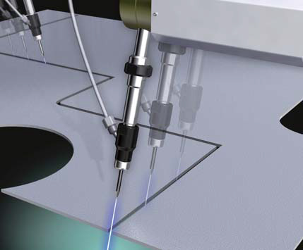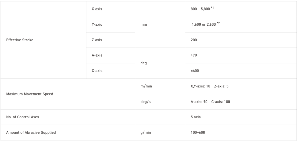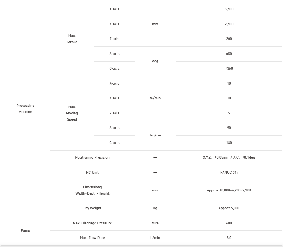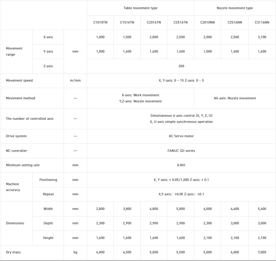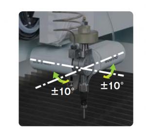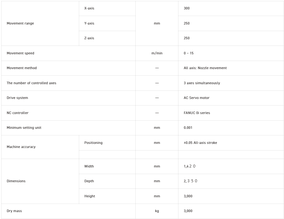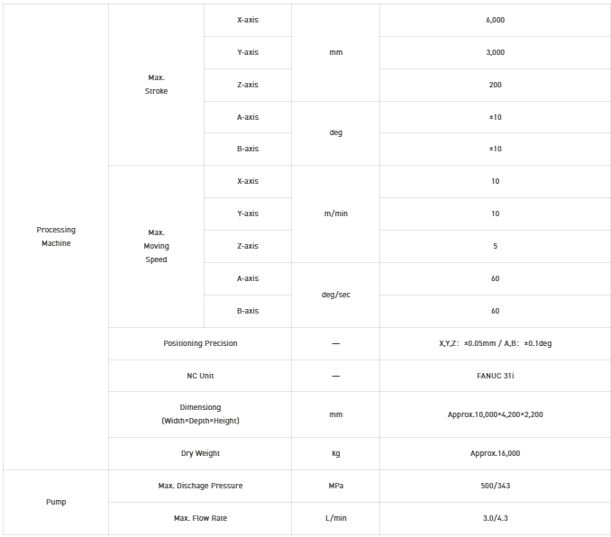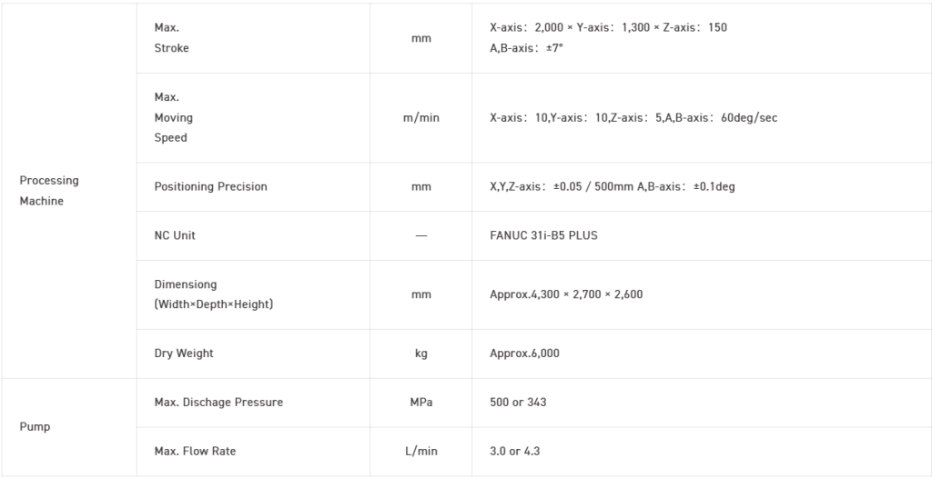 High rigidity by dual-axis gantry, low center of gravity and symmetry design, and 5-axis controlled single-point focus nozzle head with a maximum tilt angle of 50 degree realize high-speed, high-precision machining.