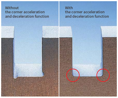 The corner acceleration and deceleration function eliminates the drag specific to waterjet cutting. It also resolves shape defects at the corners.