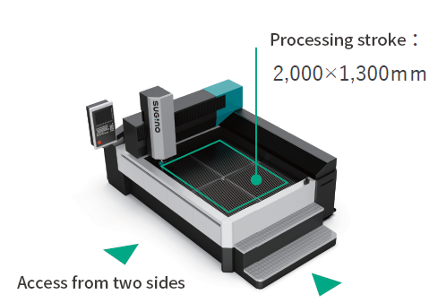Large size workpiece can be processed by maximum 6 x 3m stroke.
