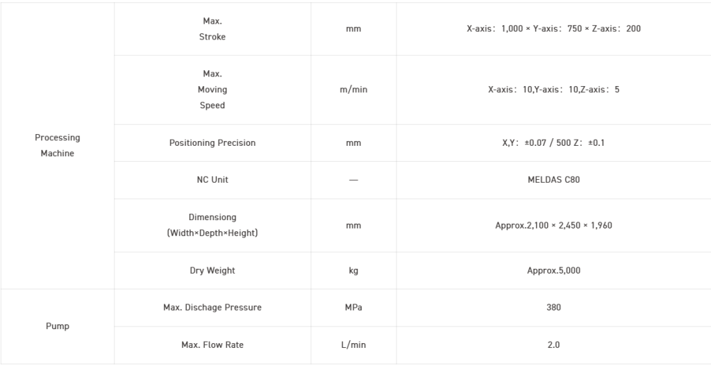 Equipped with all the necessary devices for water jet processing, including the pump, it features a compact design with an installation area of just 5 square meters.