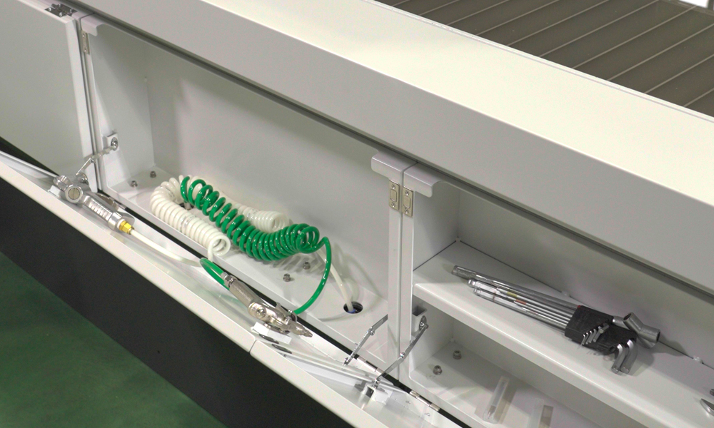 Automatic machining bit correction unit. An unit that automatically measures and corrects machining points that are misaligned after maintenance, such as nozzle replacement. Designed for Functionality. Storage box, foldable work table. Recess for toe, side step, auxiliary handle
