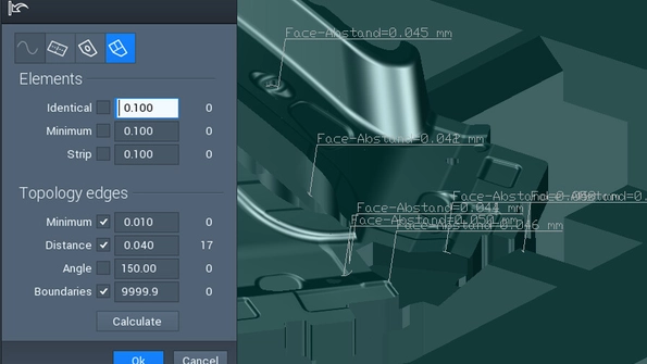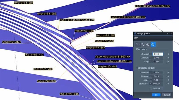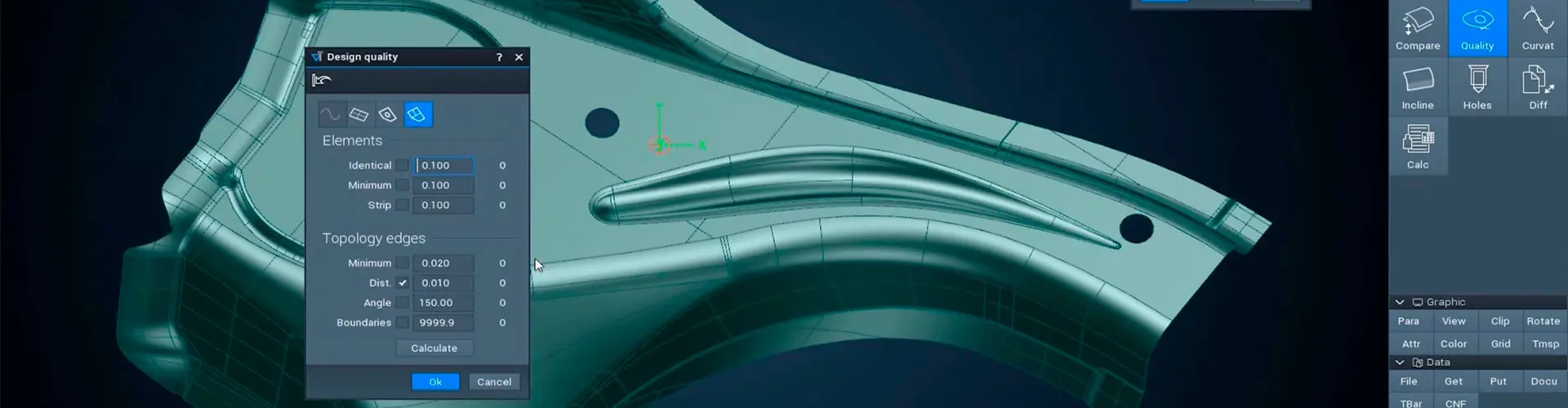 The quality analysis shows the location of problem areas in the part at a glance. This allows examination of curves, surfaces and composite surfaces (topologies).