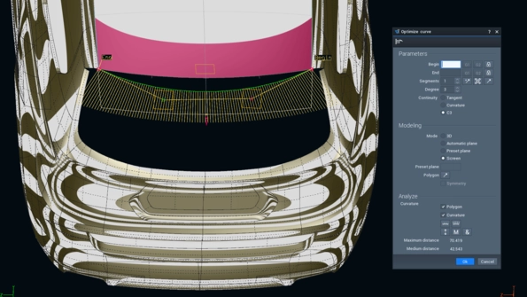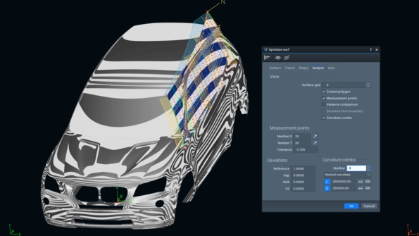 Designers are supported by analysis functions like zebra shading, curvature combs and control polygons. They can detect undesirable surface kinks and wavy surfaces due to incorrectly selected surface parameters, including excessive segmentation and unsuitable polynomial degrees.