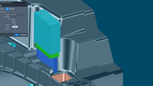 A wizard guides the user through automated assembly of the complete electrode for sinker EDM – including the probe frame, base, holder and the requisite raw material.
