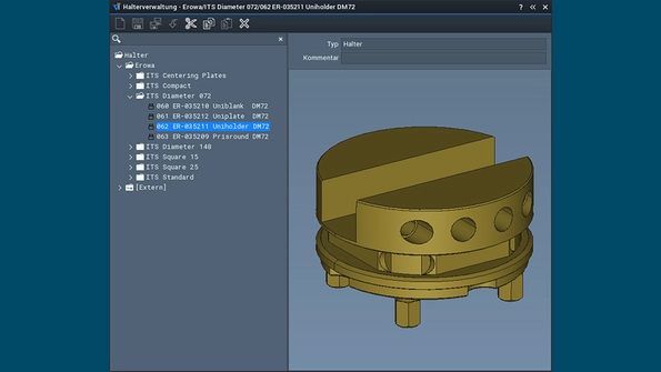 Use digital twins from the libraries to quickly select suitable stock holders and blanks. Important design features are also stored there. The suitable holder and blank for the electrode are selected with a filter. The blank is automatically oriented to the burn surfaces.
