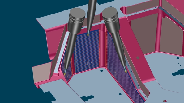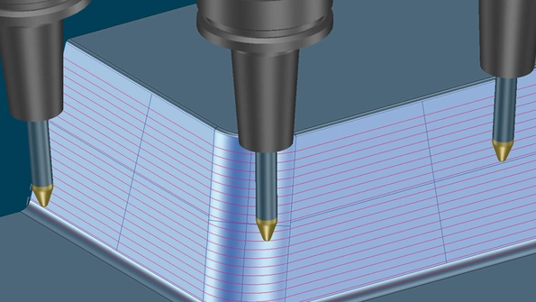 Circle-segment cutters are suitable for both 3-axis tilted machining as well as for 5-axis simultaneous machining. You gain a double speed advantage from Tebis in 5-axis machining: With no additional design overhead, you can select multiple surfaces with a simple mouse click and machine them with high-performance circle-segment cutters.