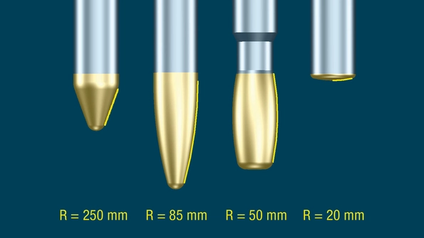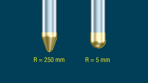 In this example, circle-segment and ball cutters have the same diameter of 10 millimeters. However, the circle-segment cutter has a radius of 250 millimeters in the cutting area, while the ball cutter has a radius of only five millimeters