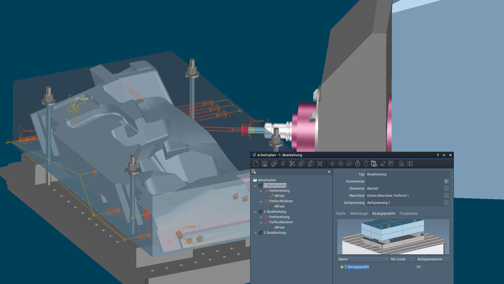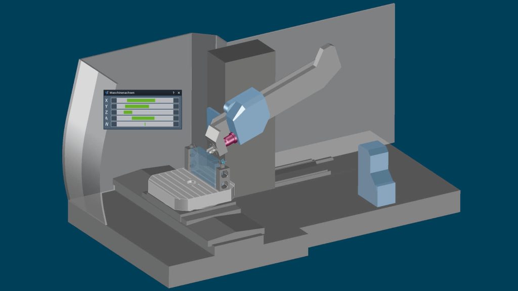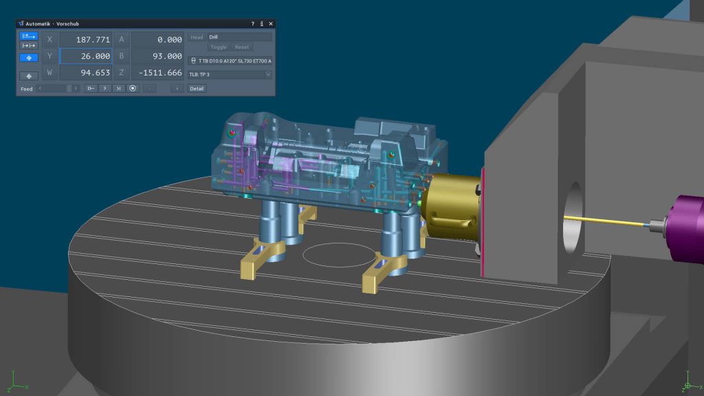 You can optimize the machining operation during the simulation: Reduce the number of machining tools and adjust the pre-determined tool lengths Check and change the setup and check the machining operation for collisions with all components. Only collision-checked NC programs are sent to the machine.