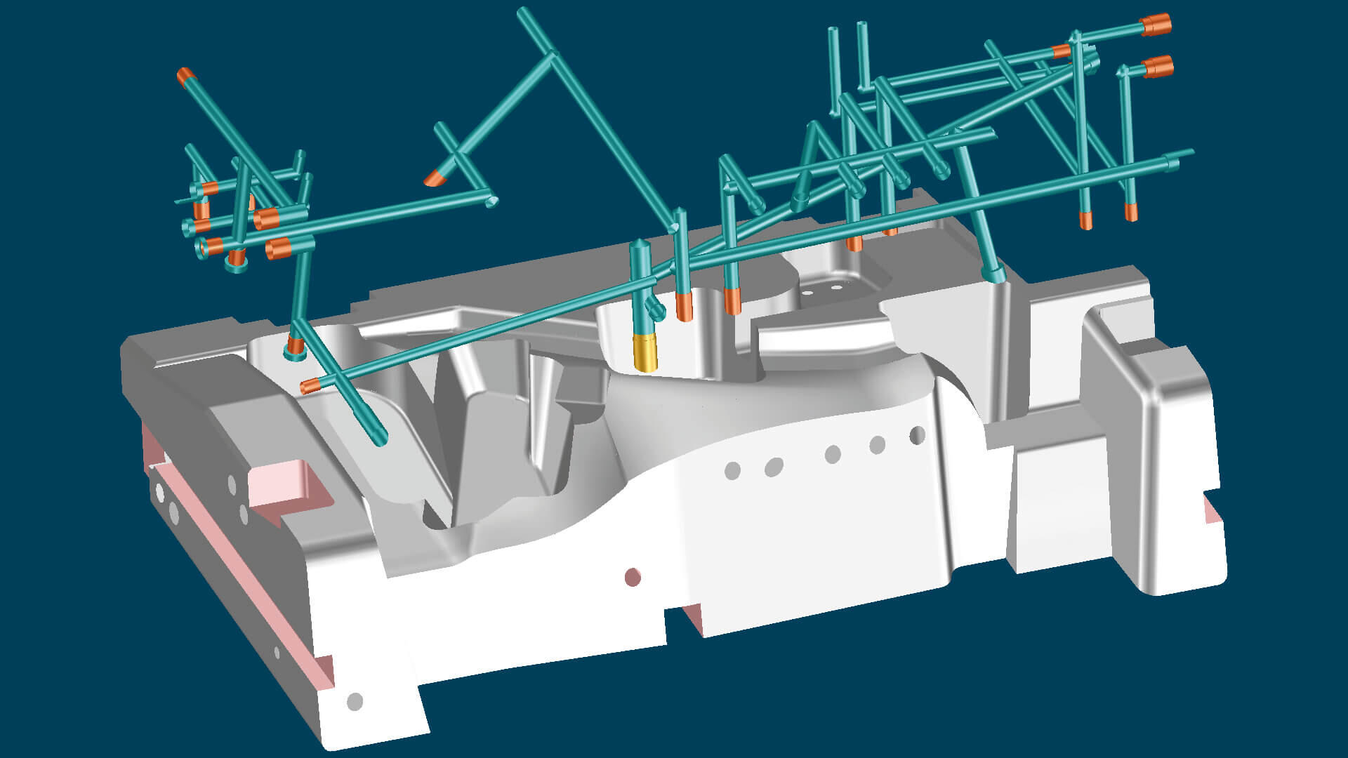 Tebis provides you with special preparation functions that cover all relevant requirements in deep-hole drilling. The key advantage: Bores are classified in Tebis as features right from the start. Features are no longer strictly CAD geometries, but rather are “intelligent” elements that include all information relevant for manufacturing. This enables important steps to be completely automated if desired during preparation.