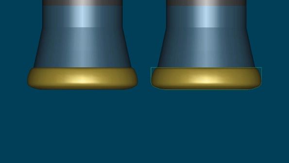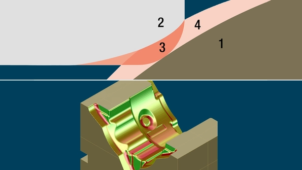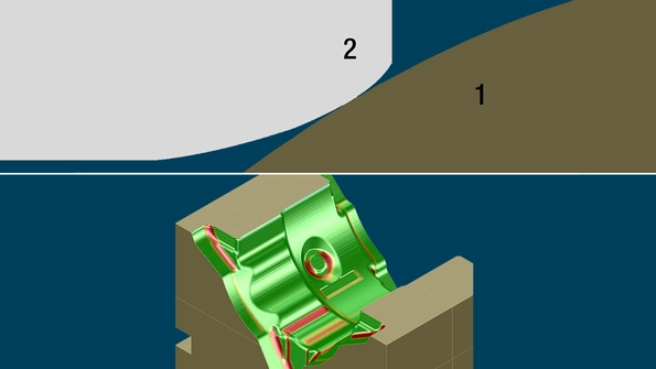 In Tebis, the actual tool contourof the HFC tool (2) is used for programming. Geometry (1) is contacted with high precision. After prefinishing, the only material remaining is in areas that cannot be machined with the selected tool. This allows HFC tools to be optimally employed, and not just for roughing but also for prefinishing