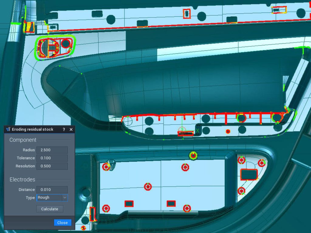Let Tebis support you in the automatic search for all areas that still need to be machined after milling. This analysis before sinker EDM is based on the smallest milling tool used.