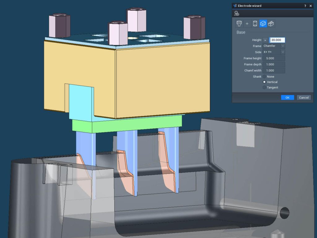 The burn surfaces of the electrode can be resolved from the geometry at the click of a button. Use powerful interactive graphical functions to lengthen and complete the electrode. A wizard guides the user through assembly of the complete electrode for sinker EDM – including the probe frame, base, holder and the requisite raw material.