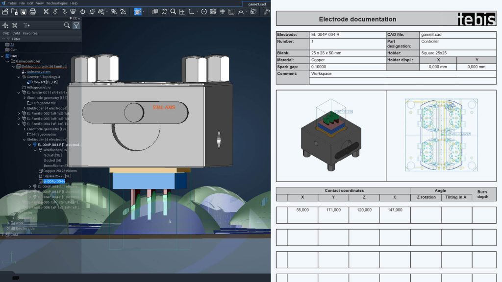 Tebis puts you in control of the complexities of sinker EDM.  Tebis supports the entire process from automatic detection of the areas to be eroded to convenient object-oriented design of the electrodes, their methodical NC machining, to measurement of the finished electrodes. All parameters that are important for manufacturing and use of the electrodes are automatically managed in electrode projects.