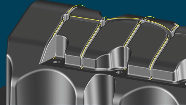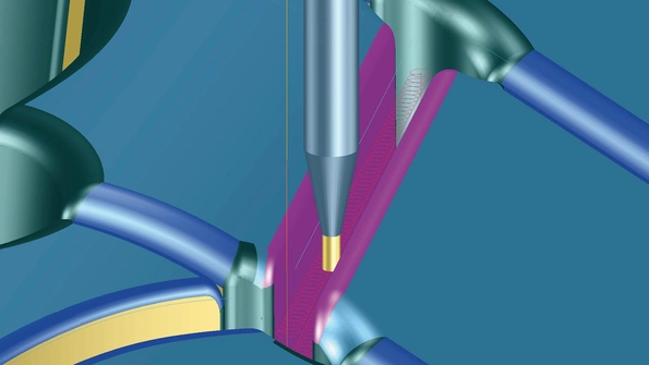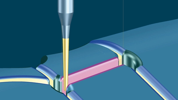 For NC programming, simply load only your standardized machining templates for the categorized geometry elements. The templates also include information on what material, what tools and what machines can best be implemented for a specific geometry. Rib and slot milling programs are easily combined: Use HPC cutters to rough the slot with only one path in full cut. If desired, you can also rough full-cut areas trochoidally and manufacture the part with conventional tools while saving a lot of time. Finish the geometry based on the center paths automatically generated during preparation: This enables the creation of a path layout optimally adapted to the geometry – the material is removed very quickly and interruptions in the NC paths in the rib intersections are avoided.